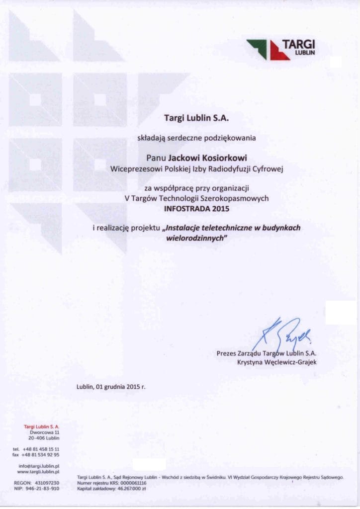 Podziękowania dla Wiceprezesa Polskiej Izby Radiodyfuzji Cyfrowej Jacka Kosiorka za współpracę przy organizacji V Targów Technologii Szerokopasmowych INFOSTRADA 2015 i realizację projektu „Instalacje teletechniczne w budynkach wielorodzinnych”.